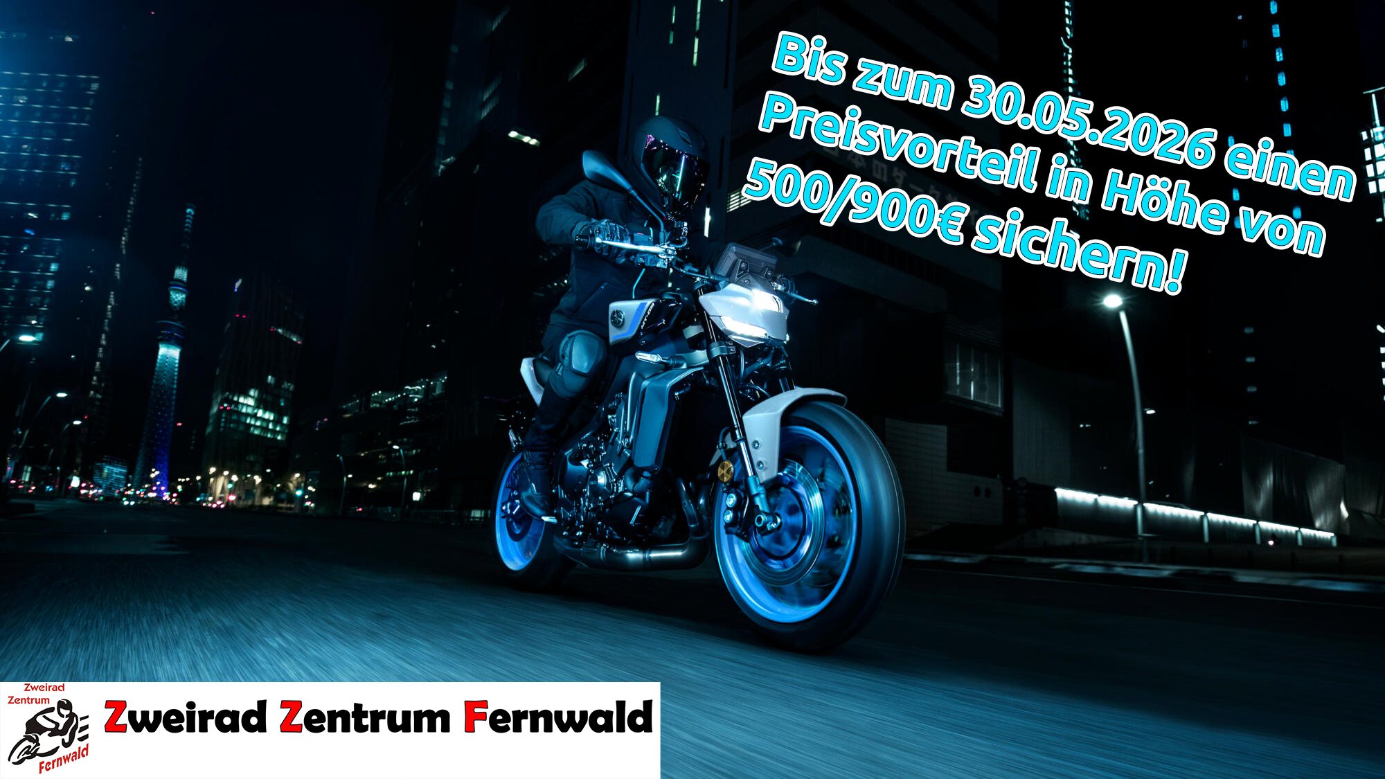 Sichere Dir bei Neukauf einer Yamaha MT-09/35kW einen Preisvorteil von 900 €. Sichere Dir bei Neukauf einer MT-09/35 kW Y-AMT oder MT-09 SP einen Preisvorteil von 500 €. Das Angebot gilt bis zum 31.05.2026 und solange der Vorrat reicht. Das Fahrzeug muss bis zum 31.05.2026 zugelassen werden.