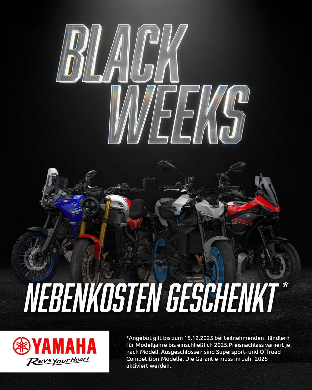 Alle Motorräder* und Roller im Angebot: Sichere dir bei unseren Herbst-Aktionswochen dein Wunschmodell zum Bestpreis! Wenn Du dich bis zum 15. Dezember für ein neues Modell entscheidest, schenken wir dir die Nebenkosten was für dich einen attraktiven Preisvorteil von bis zu 450 € bedeutet. Also gib Gas und mach dich am besten gleich auf den Weg zu deinem Yamaha Partner!